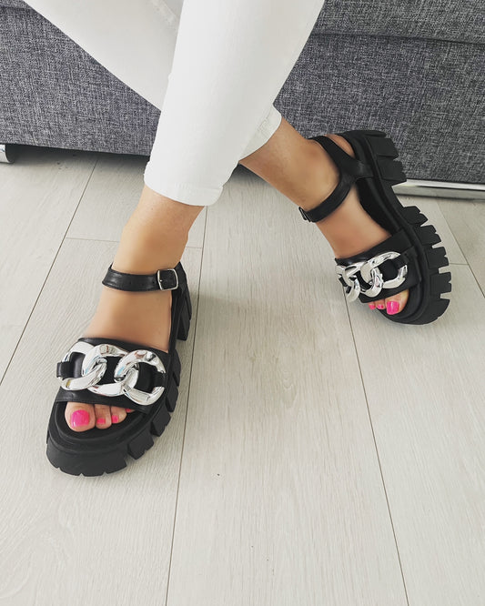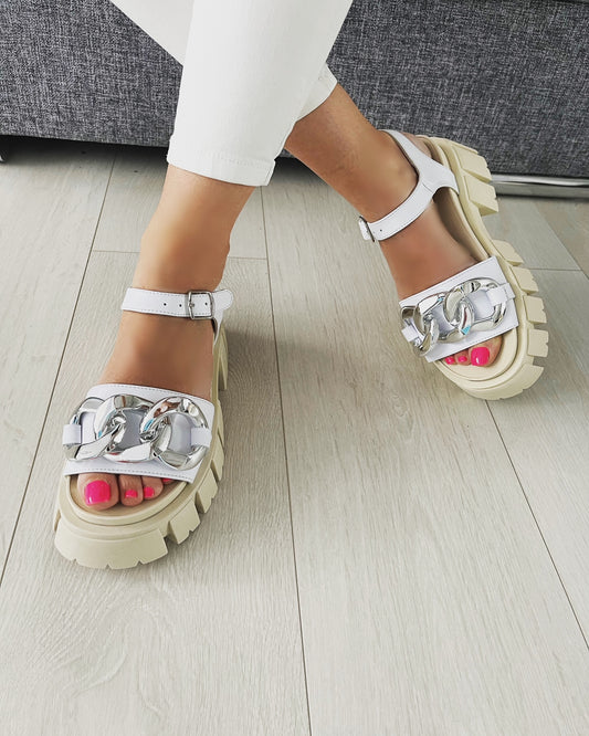Sandale Lora din piele naturală cu lanț masiv și talpă înaltă – confort și stil...