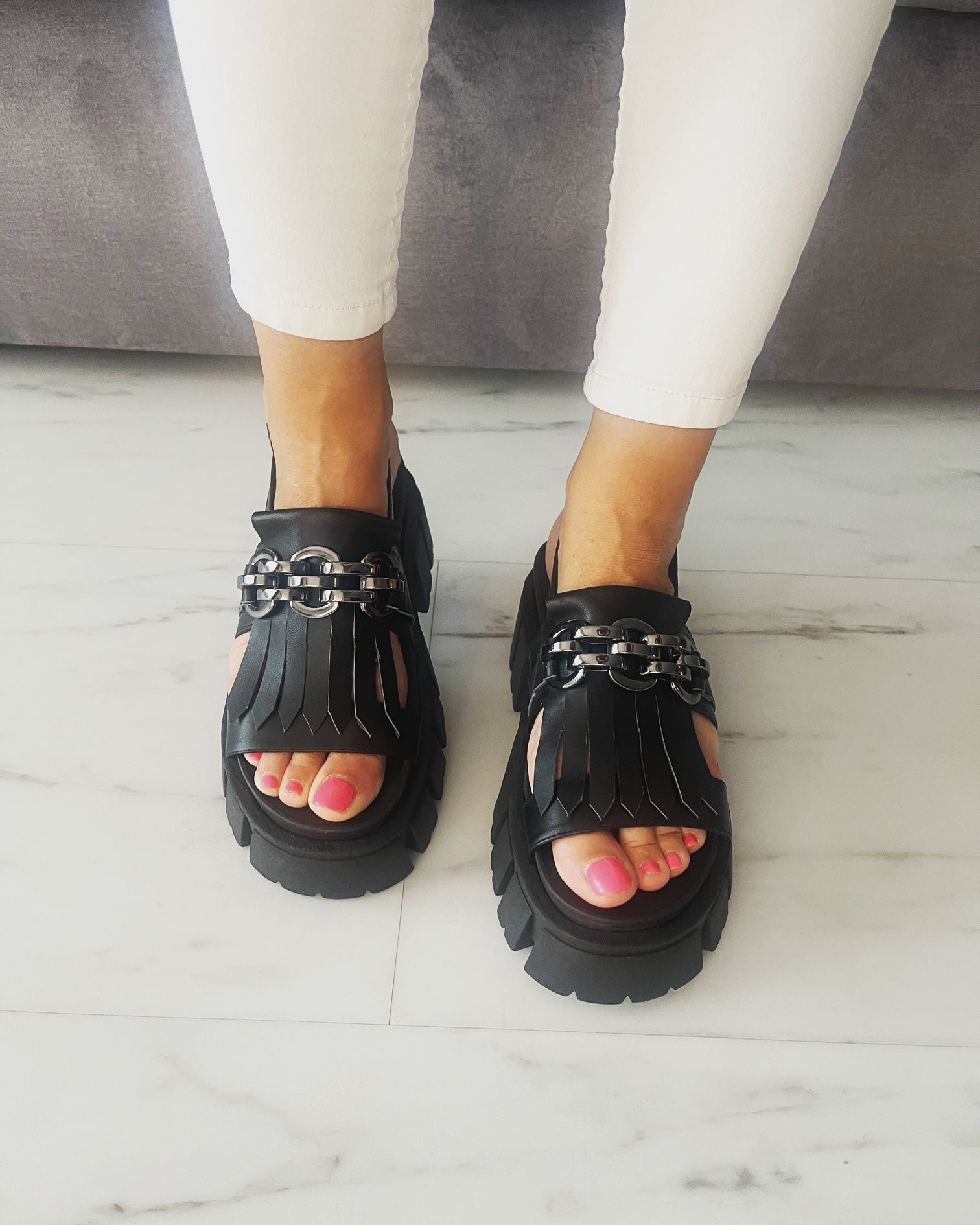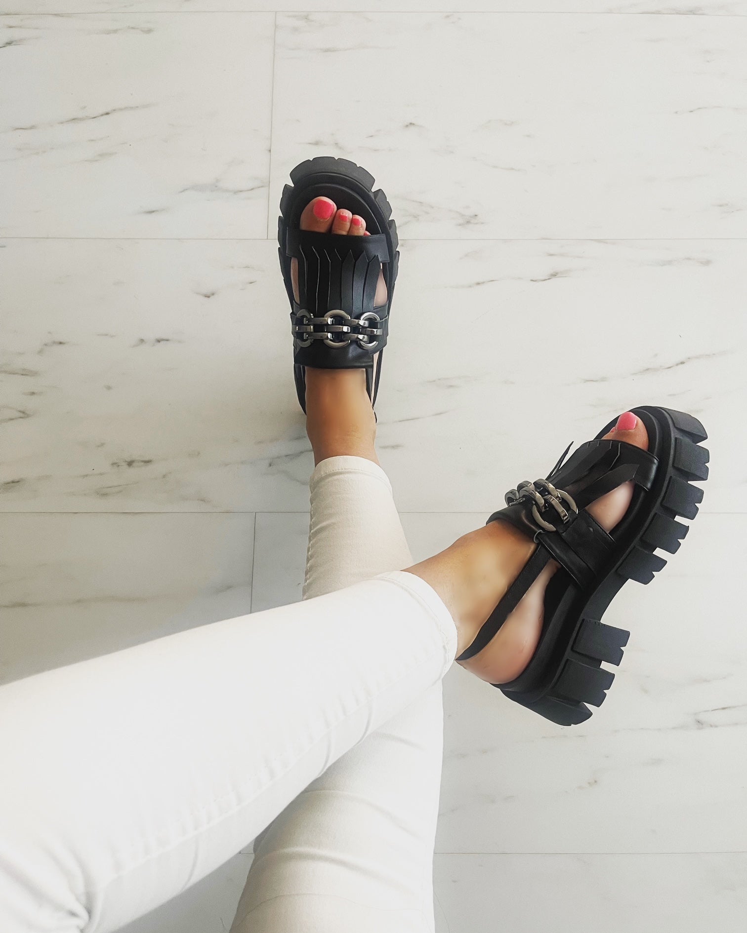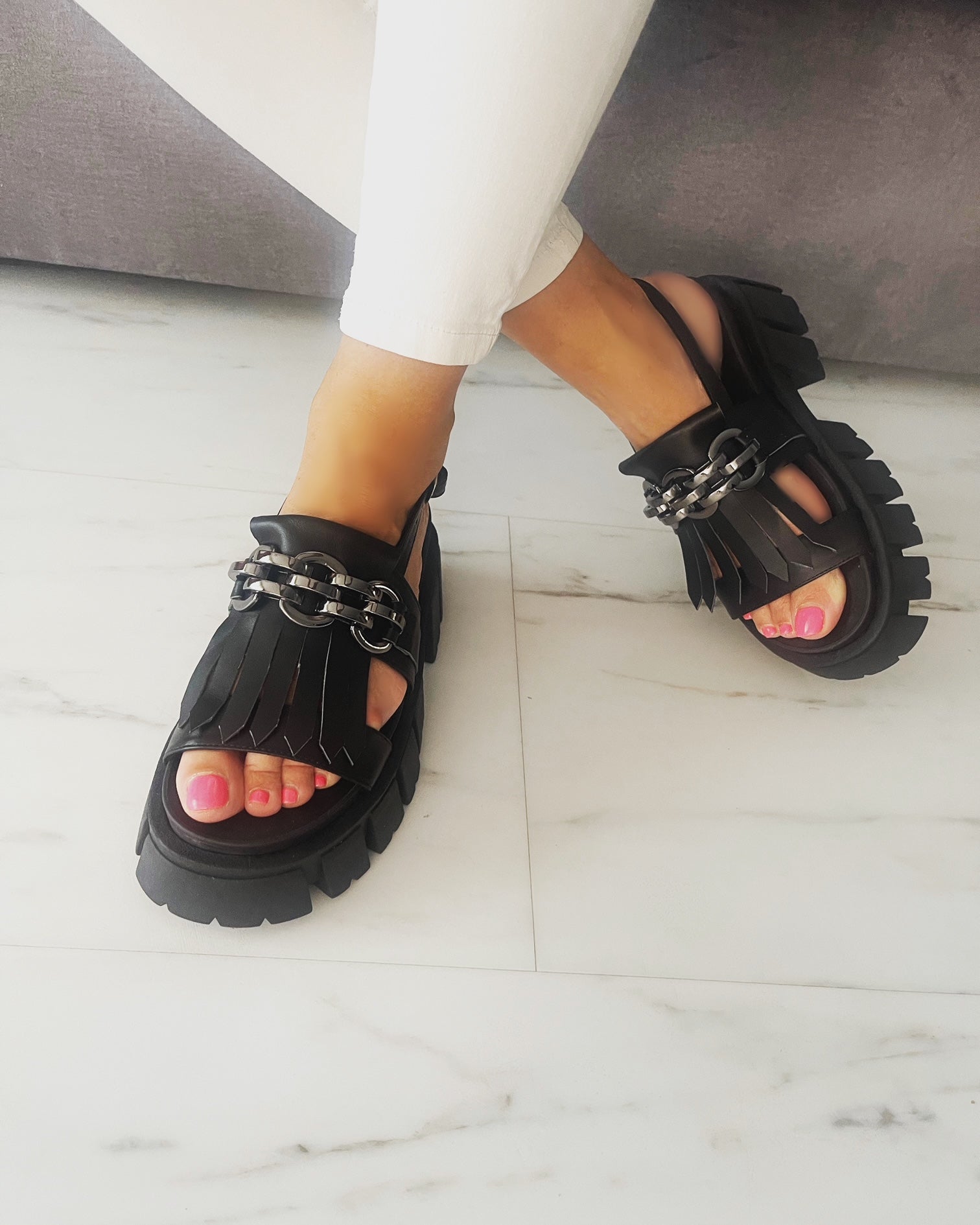 Sandale Blanca din piele naturală cu lanț masiv și talpă înaltă – confort și stil urban