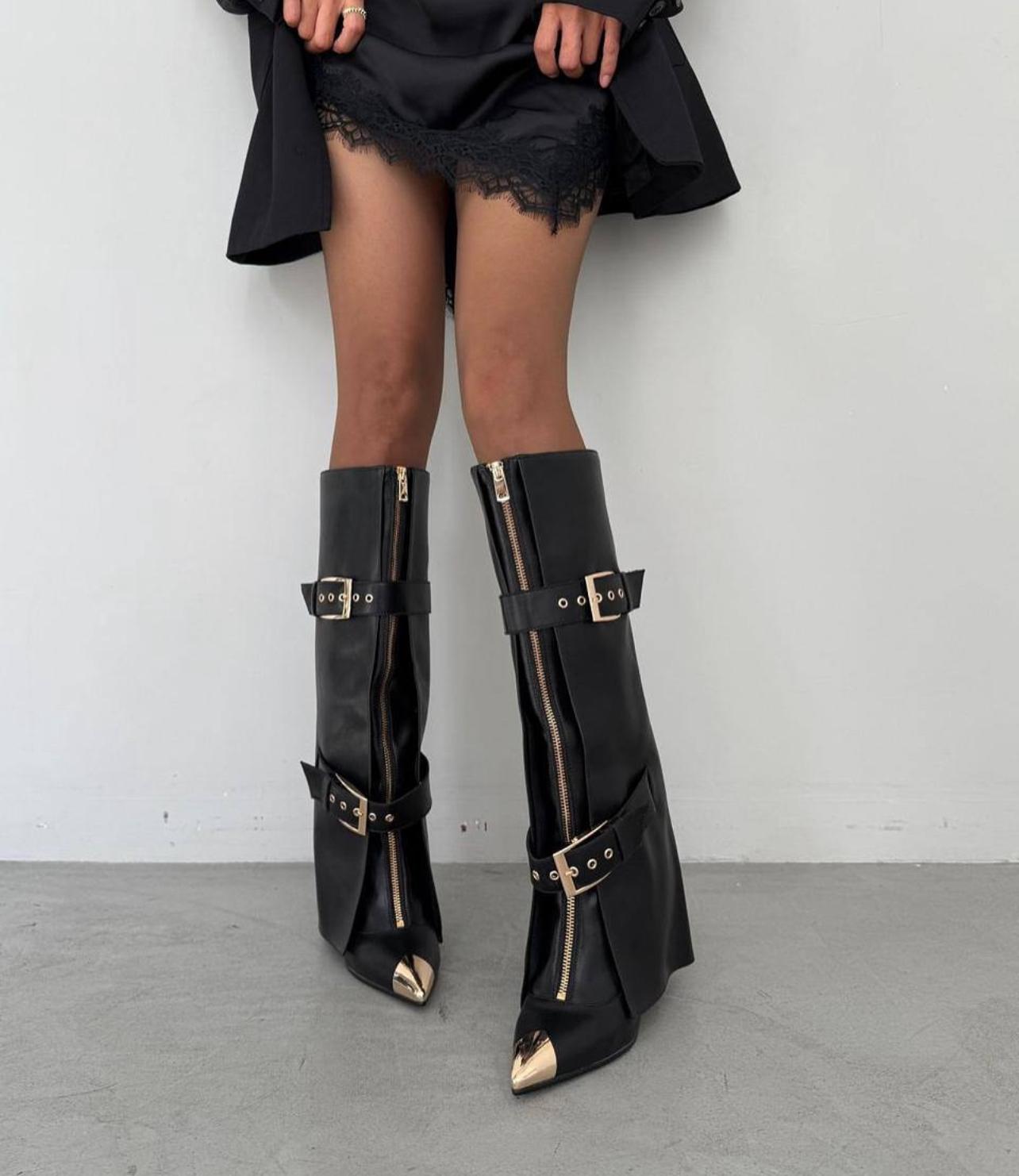 Detaliile metalice aurii – vârfurile întărite, fermoarele vizibile și cataramele decorative – adaugă un accent sofisticat, transformând acest model într-o piesă statement, ideală pentru ținute urbane, de seară sau evenimente speciale.