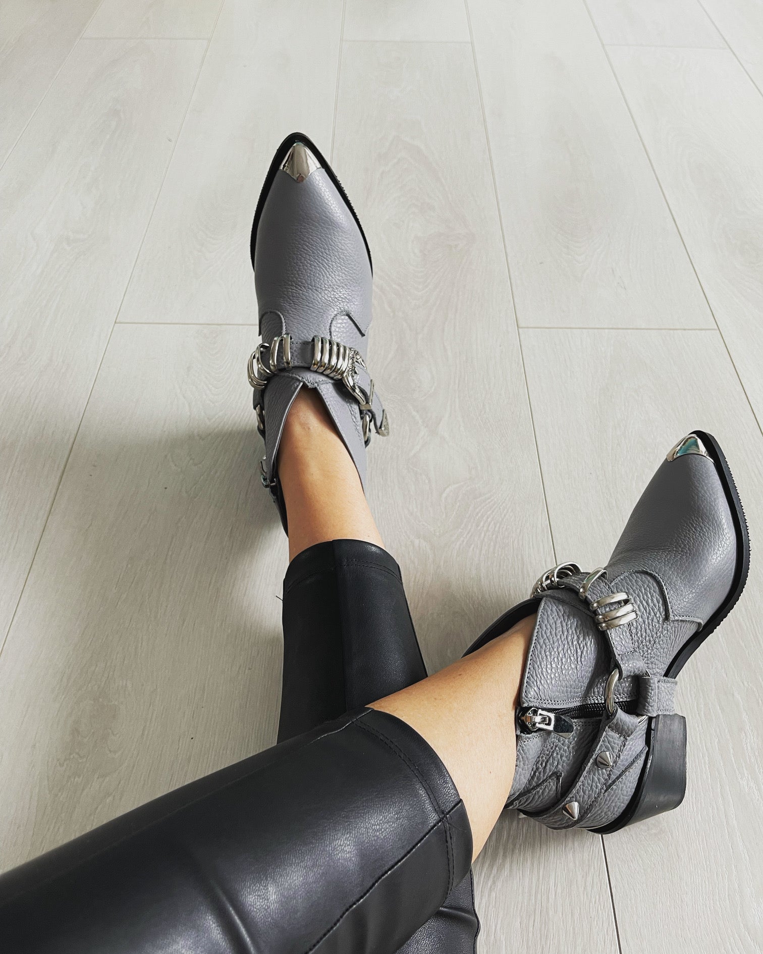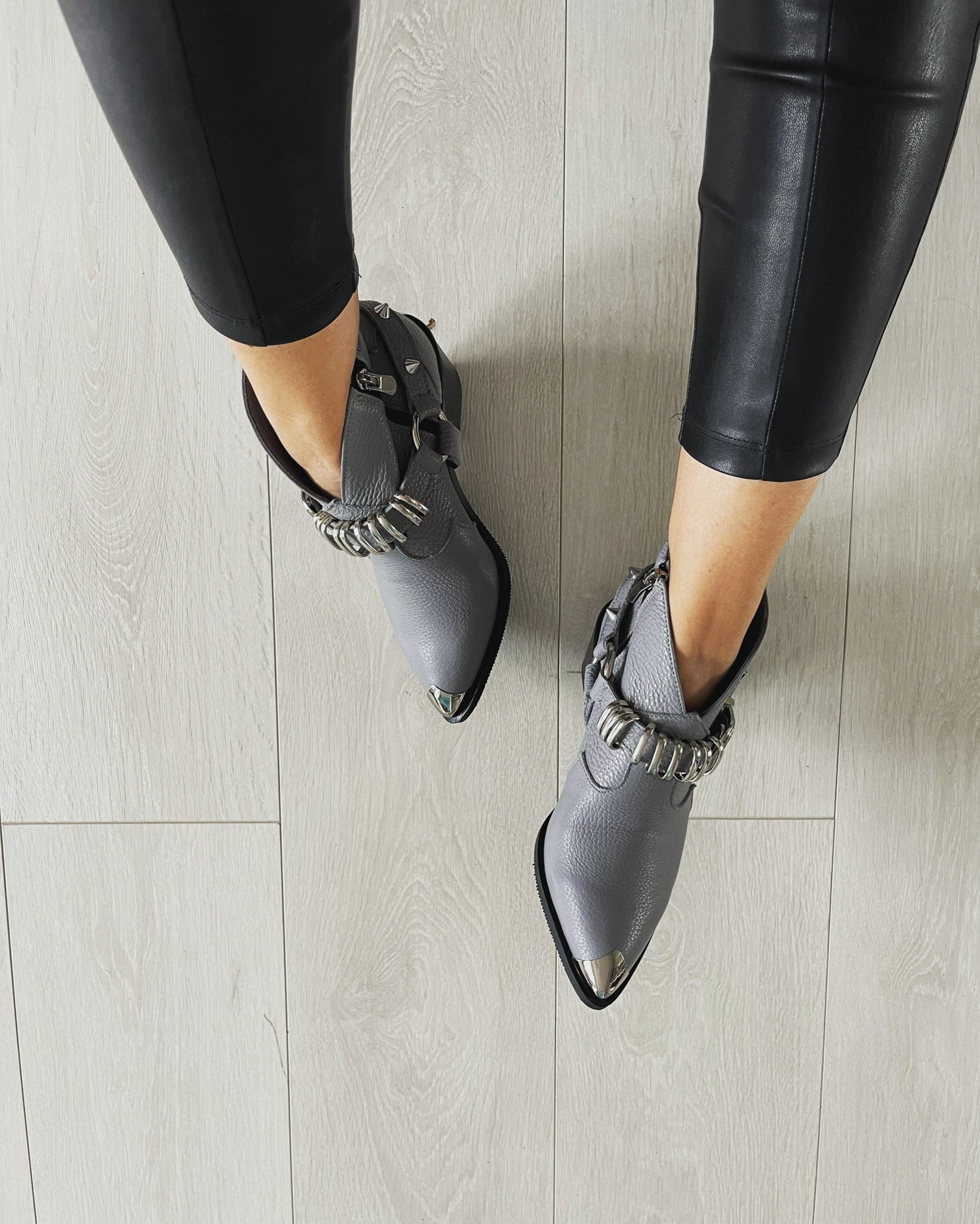 Îndrăznește să ieși în evidență cu ciocatele Doris, realizate din piele naturală de înaltă calitate, ce îmbină farmecul western cu rafinamentul urban. Designul versatil este completat de un accesoriu metalic detașabil la gleznă, care adaugă un accent sofisticat și permite personalizarea ținutei în funcție de moment.