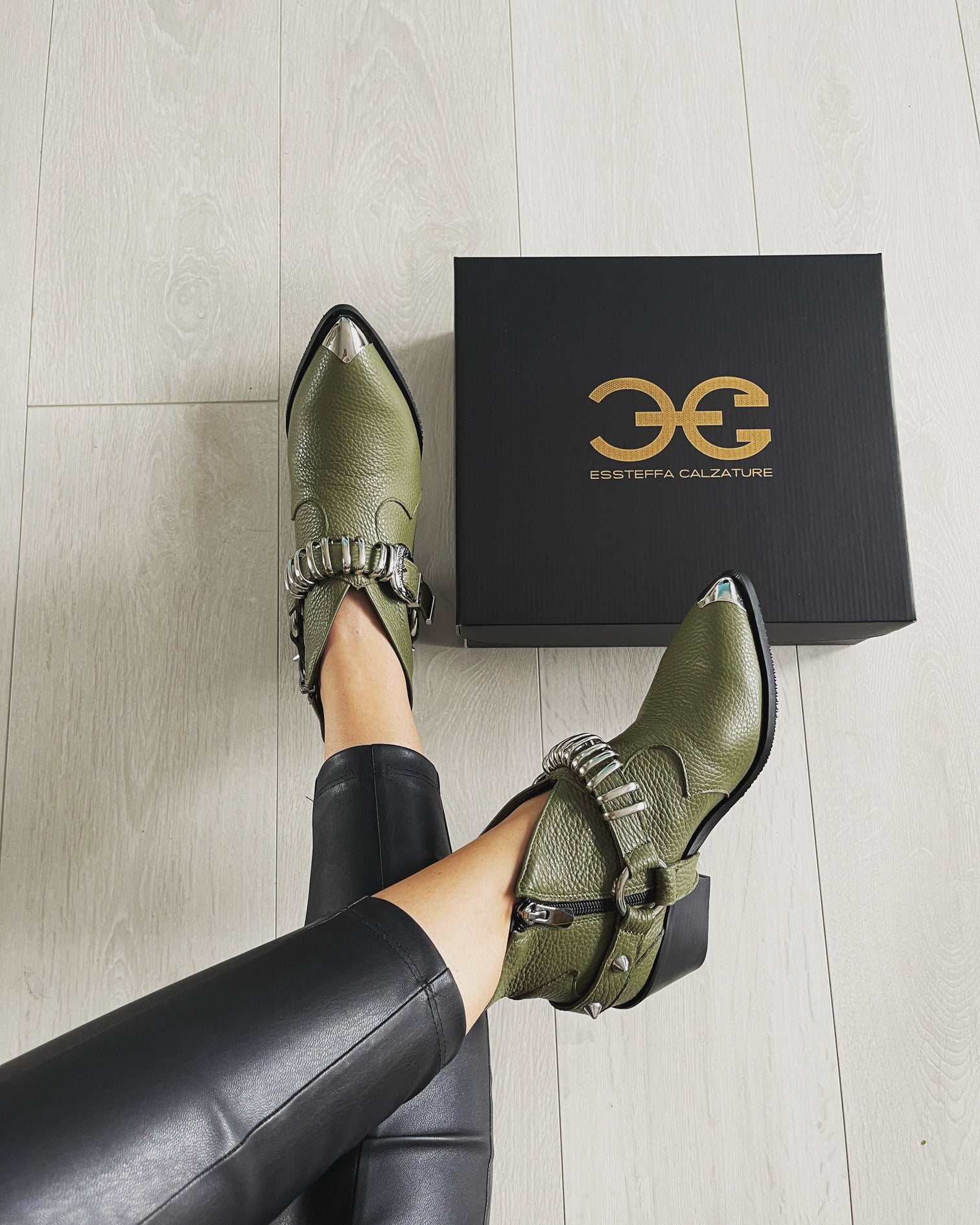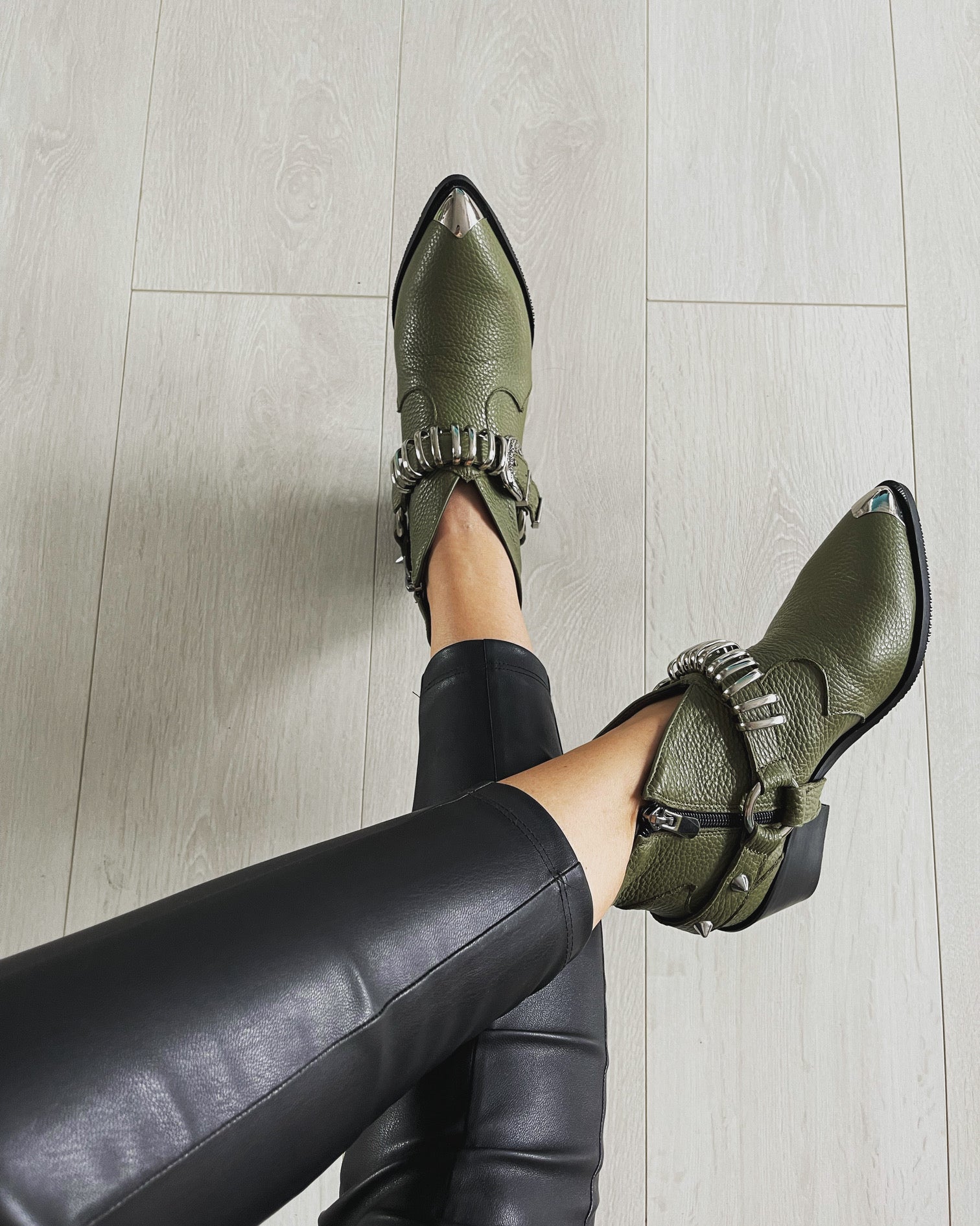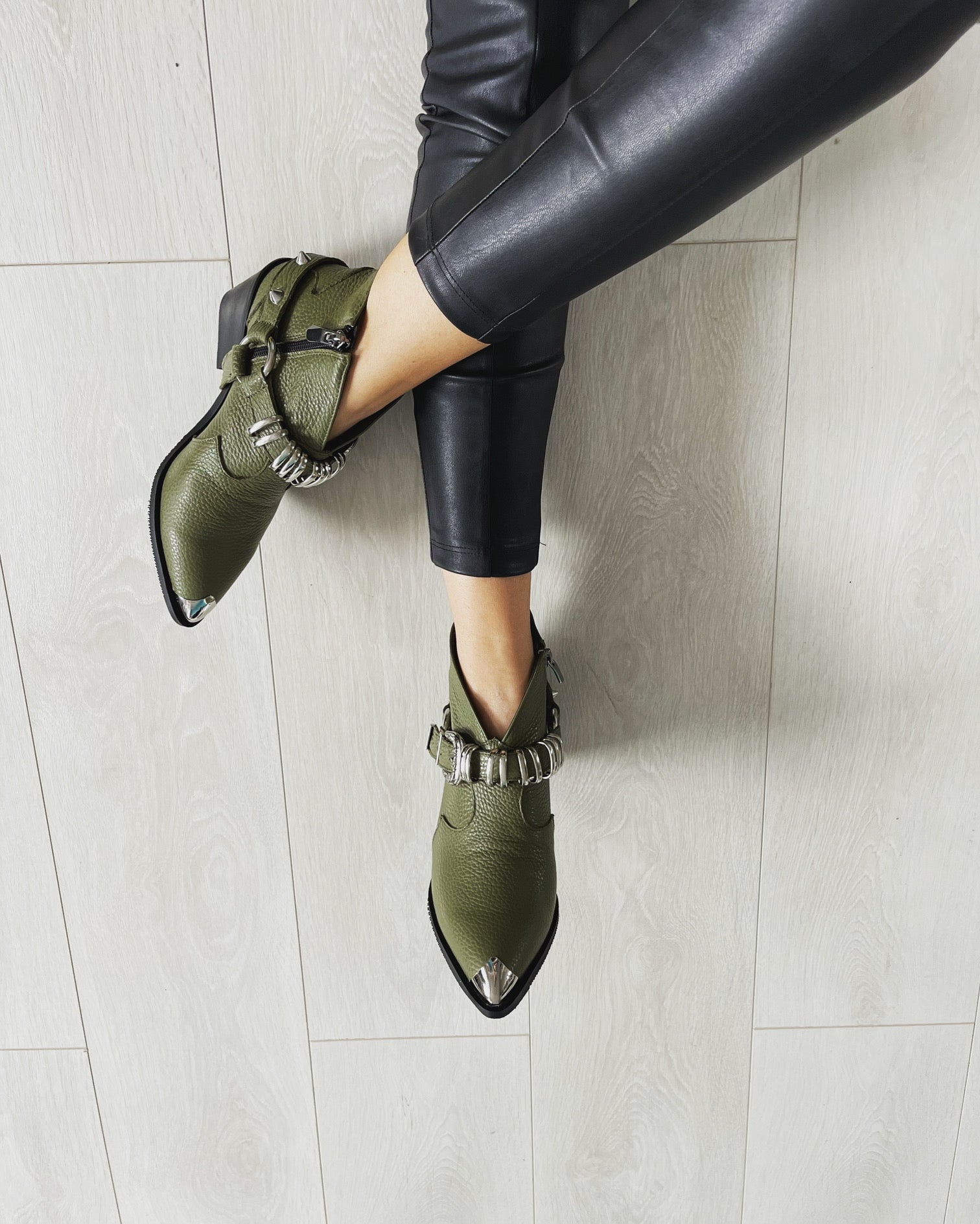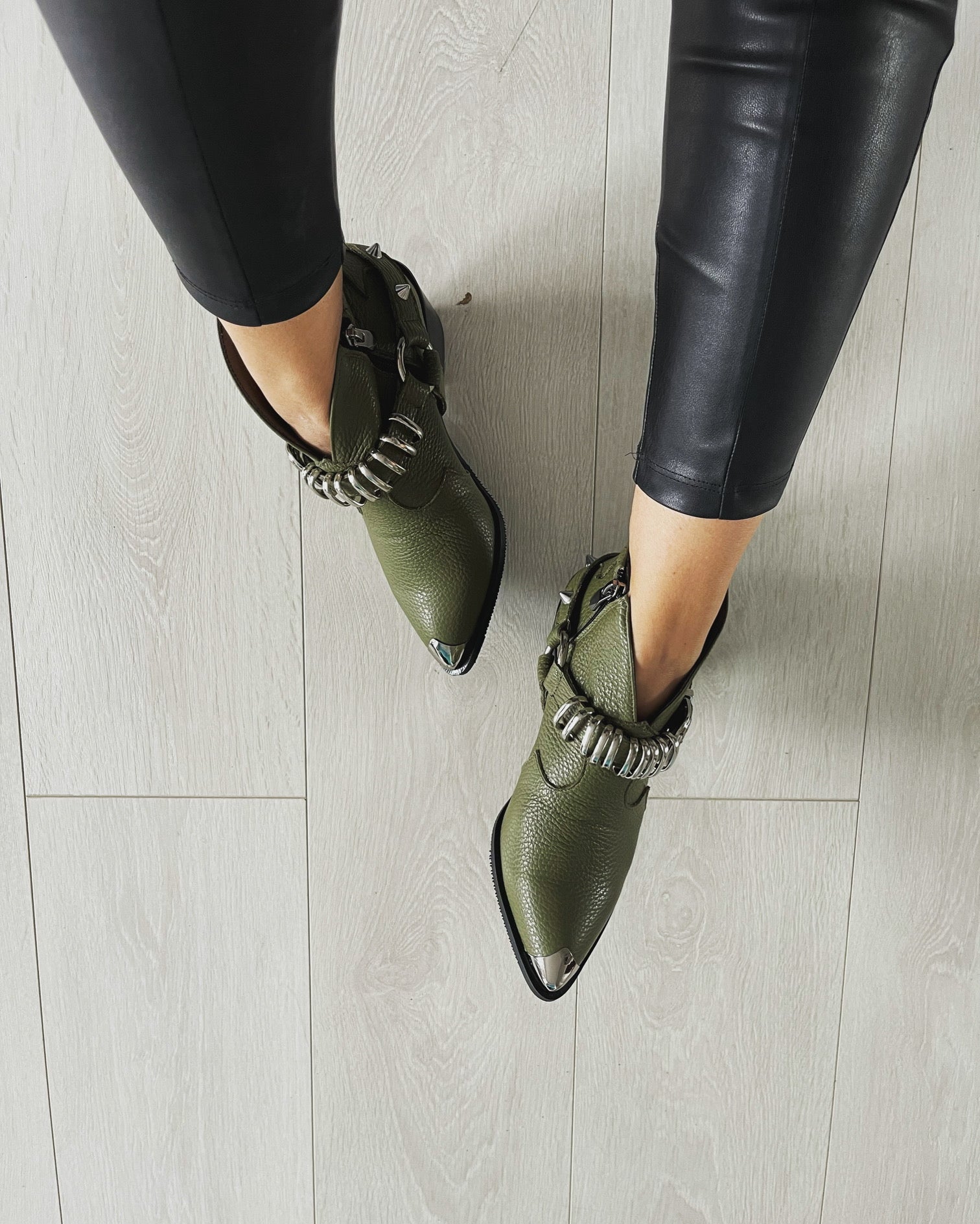 Îndrăznește să ieși în evidență cu ciocatele Doris, realizate din piele naturală de înaltă calitate, ce îmbină farmecul western cu rafinamentul urban. Designul versatil este completat de un accesoriu metalic detașabil la gleznă, care adaugă un accent sofisticat și permite personalizarea ținutei în funcție de moment.