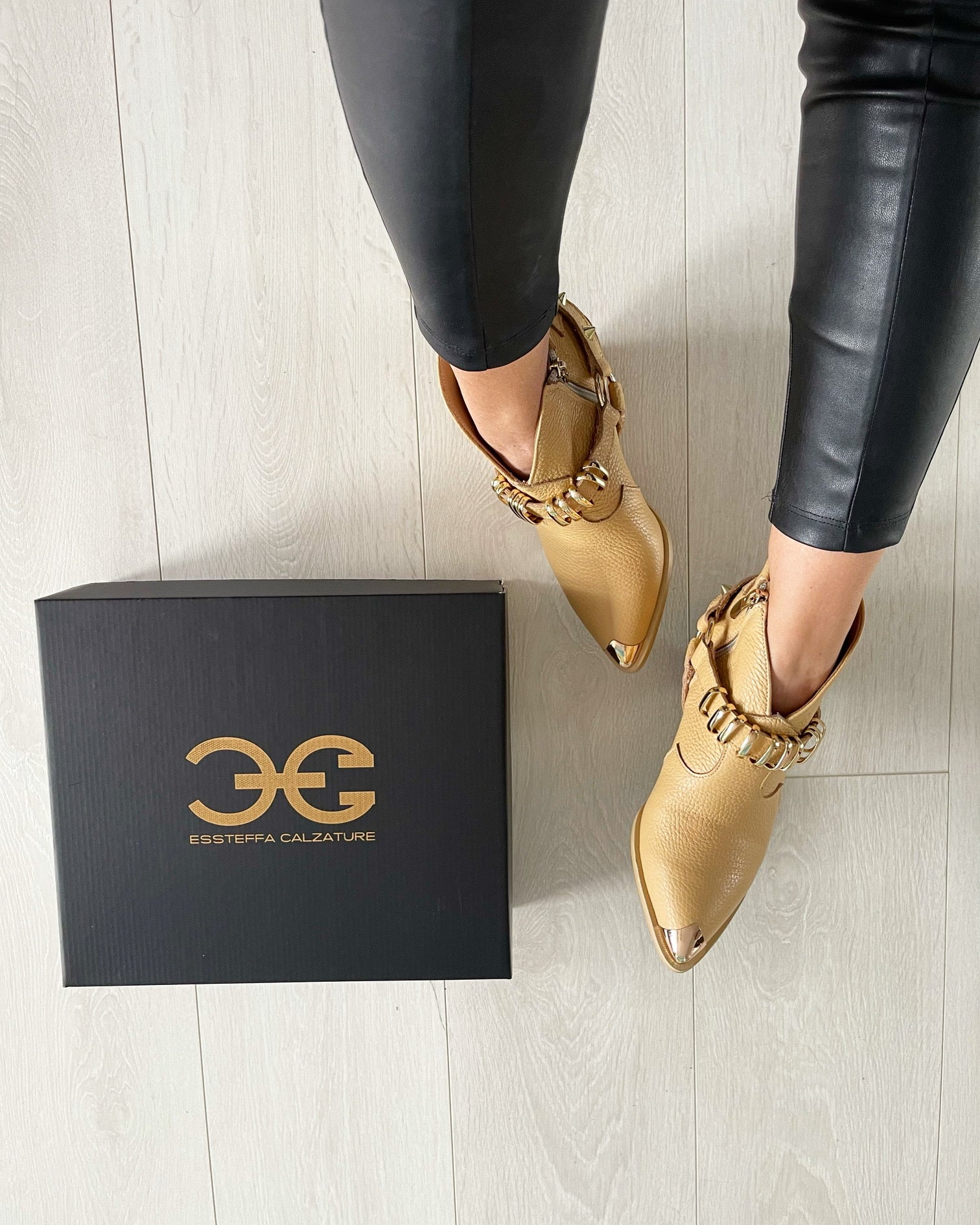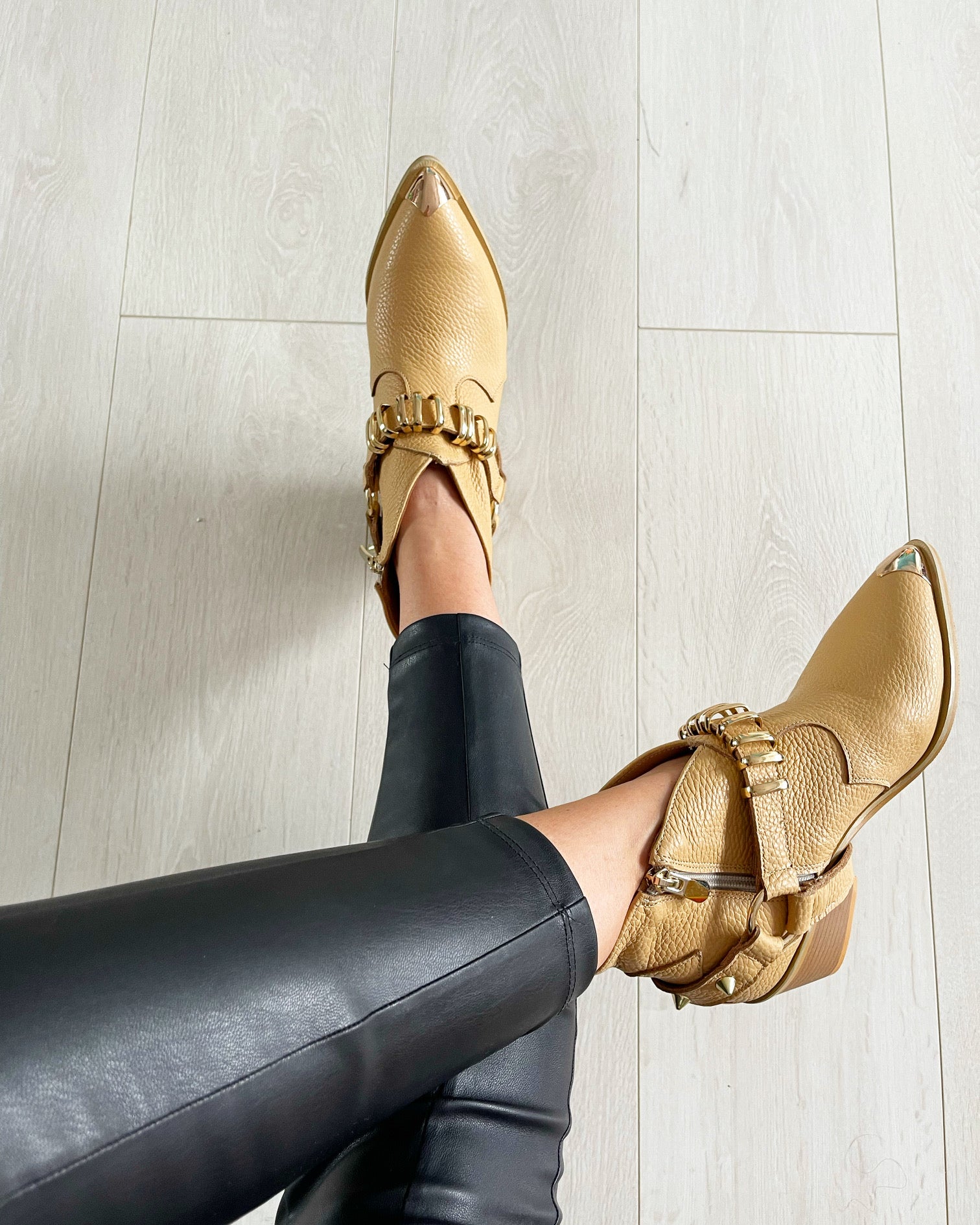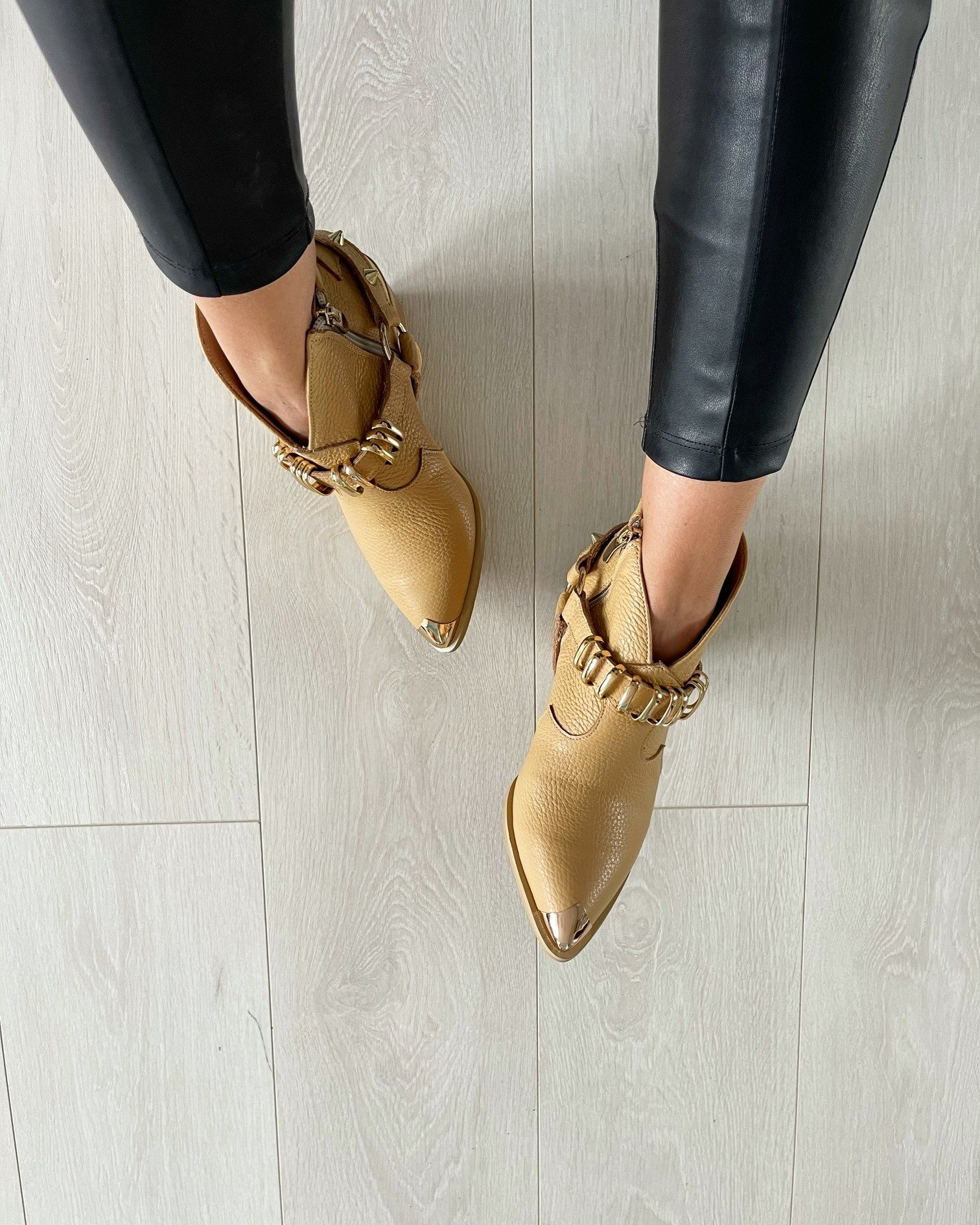 Îndrăznește să ieși în evidență cu ciocatele Doris, realizate din piele naturală de înaltă calitate, ce îmbină farmecul western cu rafinamentul urban. Designul versatil este completat de un accesoriu metalic detașabil la gleznă, care adaugă un accent sofisticat și permite personalizarea ținutei în funcție de moment.