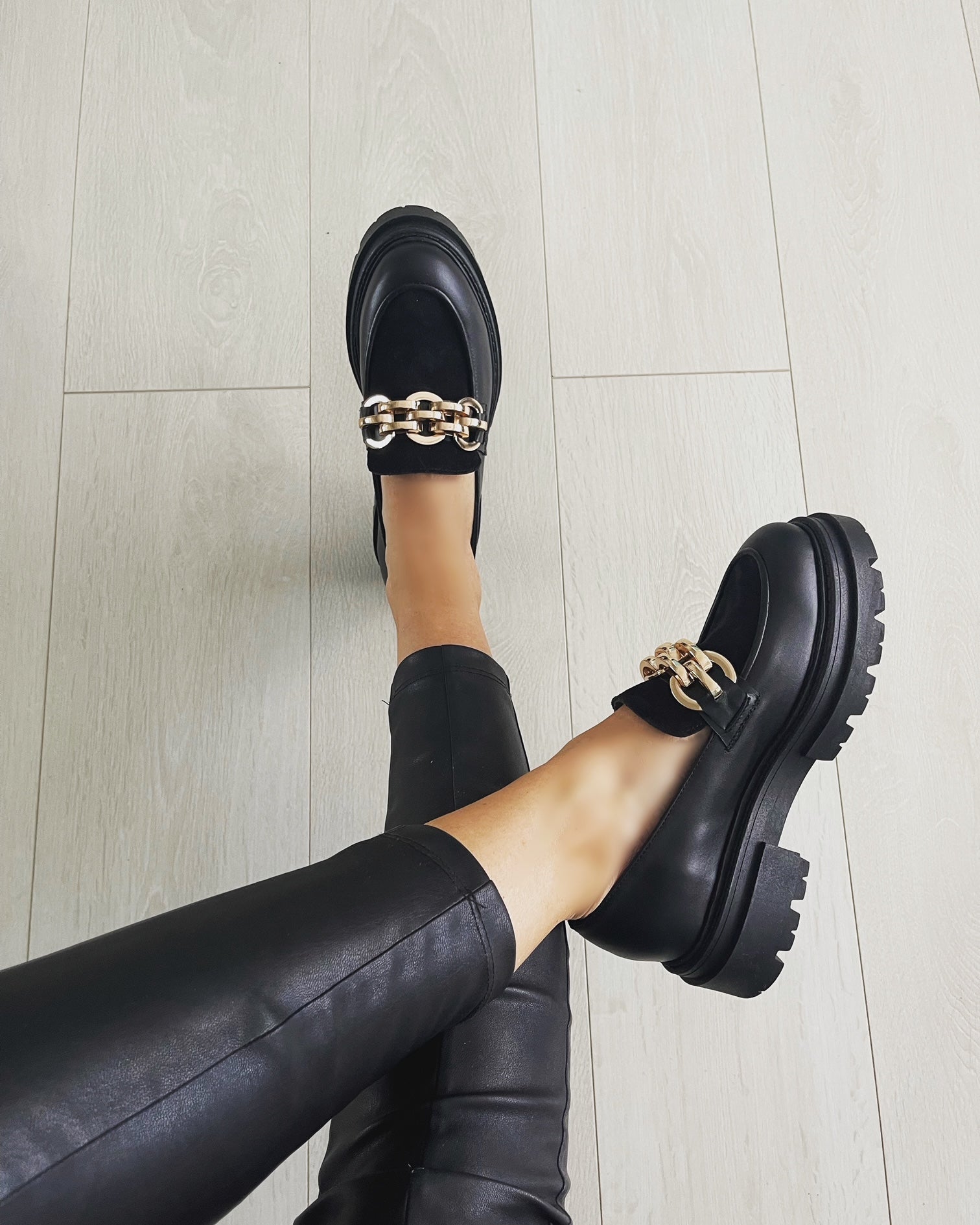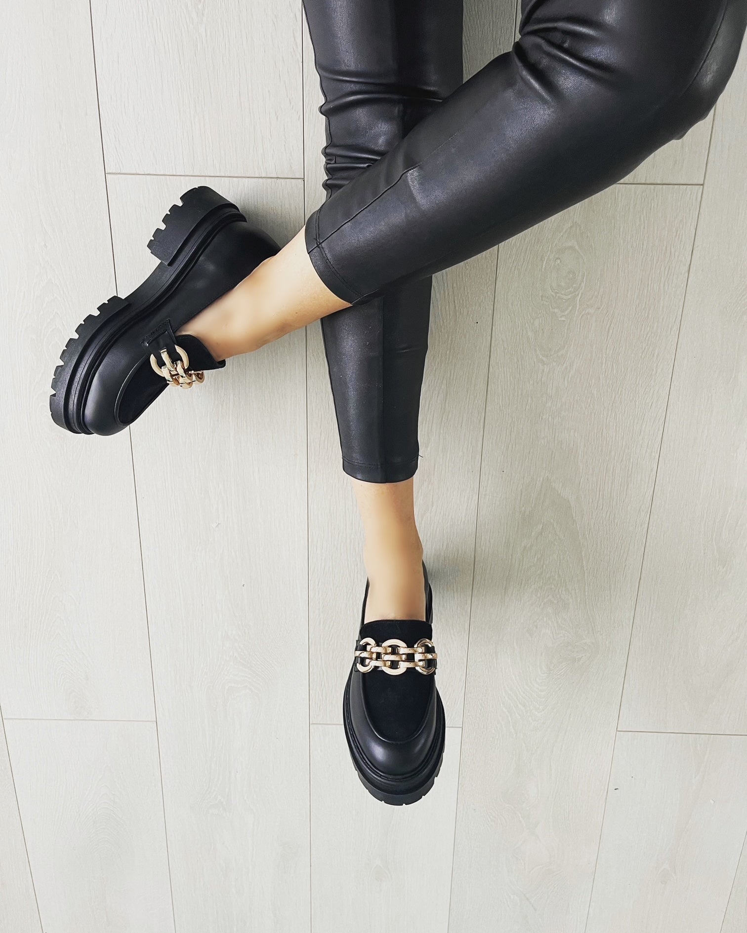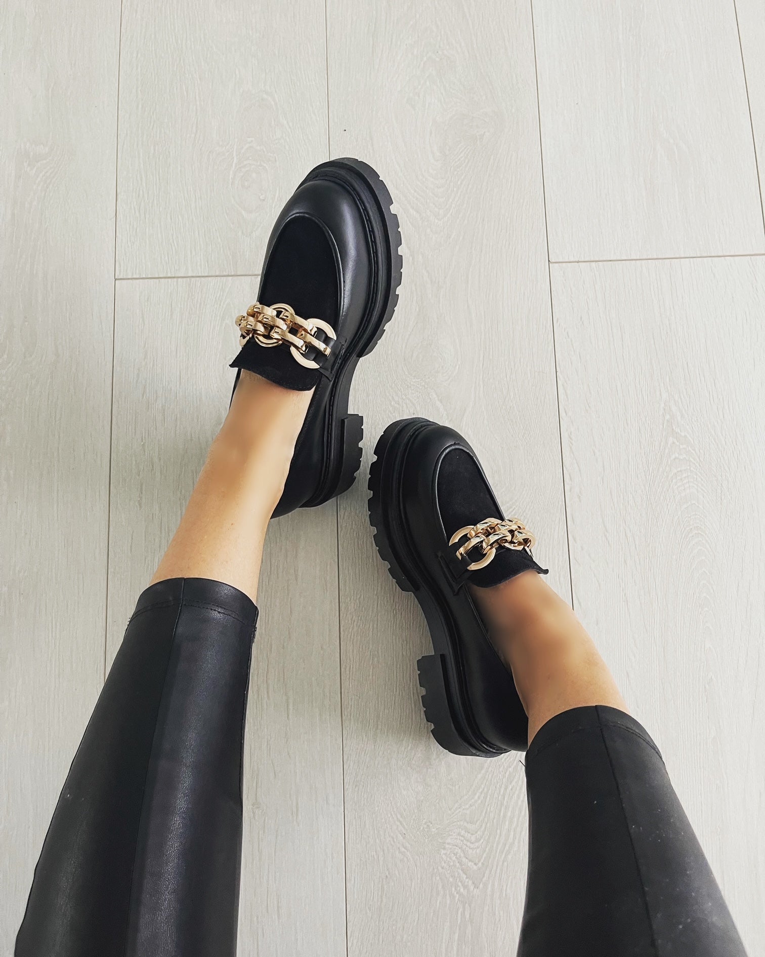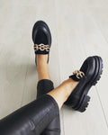 Culoare mostra: Piele neagra/ piele intoarsa neagra / accesoriu metalic auriu