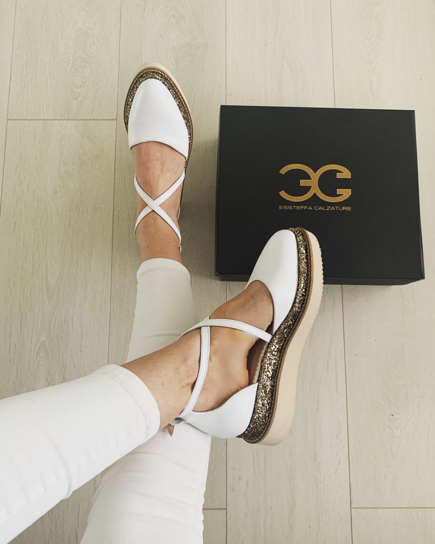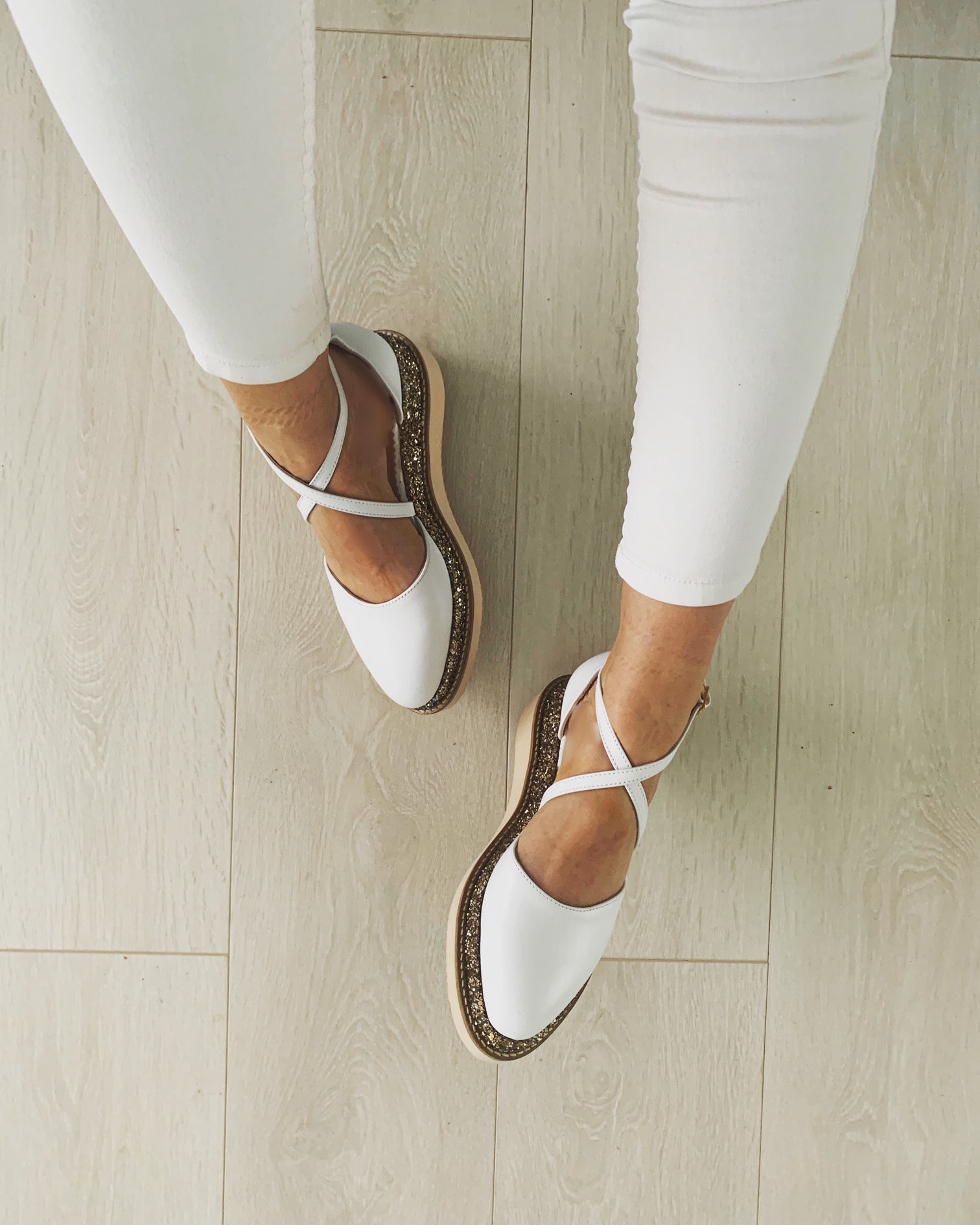 Culoare : Piele alba/ platforma talpa glitter auriu